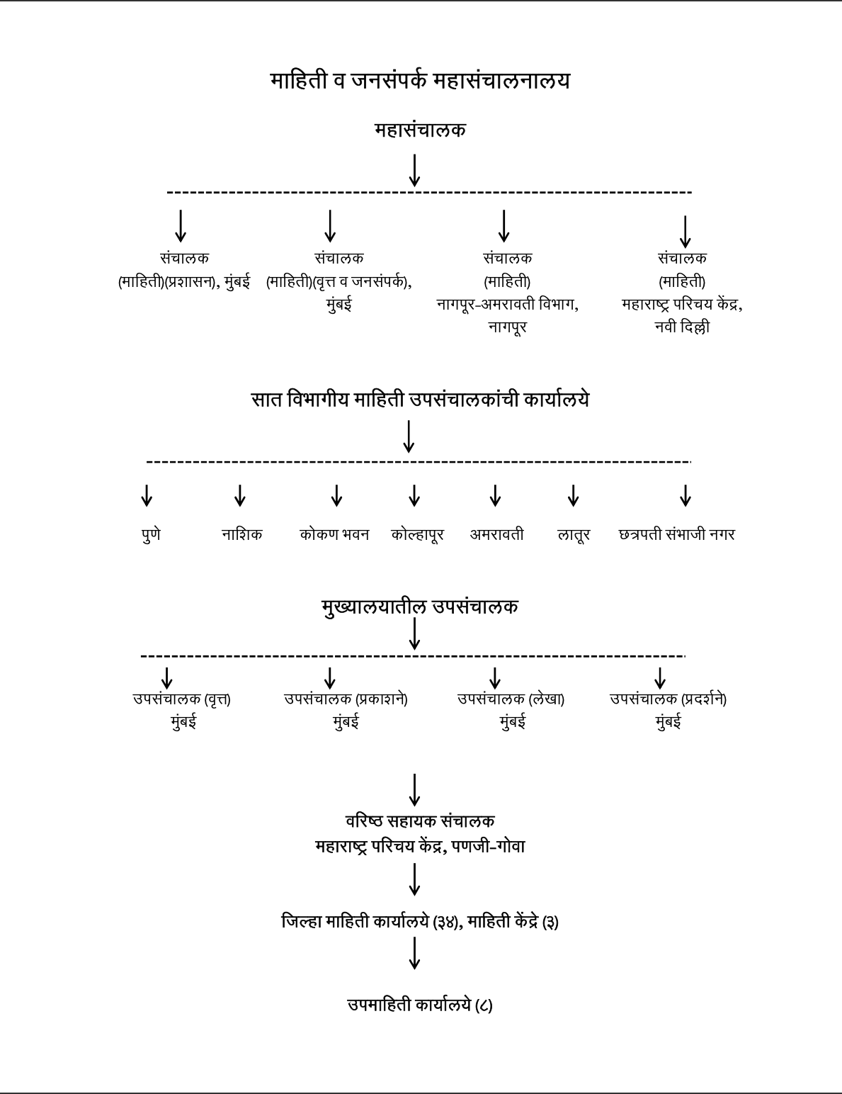 महासंचालक या पदावरील सनदी अधिकारी या यंत्रणेचा प्रमुख असतो. महासंचालकांच्या अखत्यारीत संचालक (माहिती)(प्रशासन), संचालक (माहिती)(वृत्त व जनसंपर्क), मुंबई येथे व नवी दिल्ली, नागपूर येथेही संचालक (माहिती) ही पदे आहेत. विभागीय स्तरावर ७ उपसंचालकांची पदे आहेत. (कोकण, नाशिक, पुणे, कोल्हापूर, छत्रपती संभाजीनगर, लातूर, अमरावती) आणि जिल्हा माहिती कार्यालये (३४) कार्यरत आहेत. तसेच महाराष्ट्रातील योजनांची माहिती महाराष्ट्राबाहेरील जनतेला देण्यासाठी दिल्ली आणि गोवा येथे महाराष्ट्र परिचय केंद्रे कार्यरत आहेत.