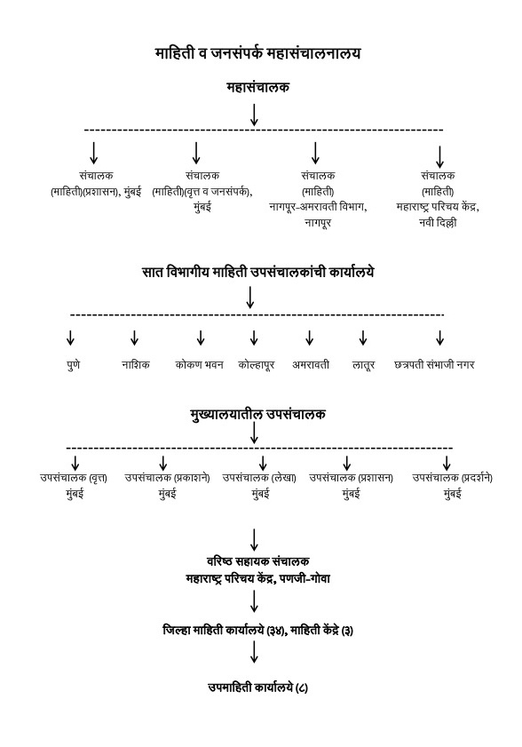 महासंचालक या पदावरील सनदी अधिकारी या यंत्रणेचा प्रमुख असतो. महासंचालकांच्या अखत्यारीत संचालक (माहिती)(प्रशासन), संचालक (माहिती)(वृत्त व जनसंपर्क), मुंबई येथे व नवी दिल्ली, नागपूर येथेही संचालक (माहिती) ही पदे आहेत. विभागीय स्तरावर ७ उपसंचालकांची पदे आहेत. (कोकण, नाशिक, पुणे, कोल्हापूर, छत्रपती संभाजीनगर, लातूर, अमरावती) आणि जिल्हा माहिती कार्यालये (३४) कार्यरत आहेत. तसेच महाराष्ट्रातील योजनांची माहिती महाराष्ट्राबाहेरील जनतेला देण्यासाठी दिल्ली आणि गोवा येथे महाराष्ट्र परिचय केंद्रे कार्यरत आहेत.